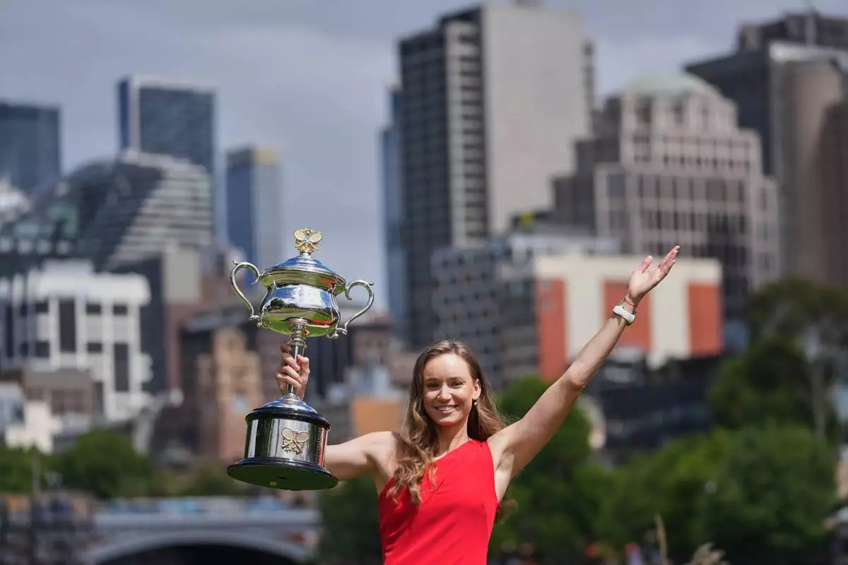 Elena Rybakina of Kazakhstan poses with Daphne Akhurst Memorial Cup on the banks of the Yarra River the morning after defeating Aryna Sabalenka of Belarus in the women's singles final at the Australian Open tennis championship in Melbourne, Australia, Sunday, Feb. 1, 2026. (AP Photo/Dita Alangkara)
