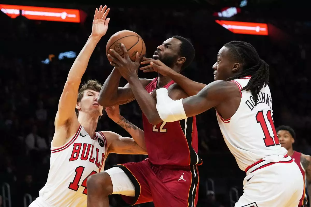 Miami Heat forward Andrew Wiggins (22) drives to the basket as Chicago Bulls forward Matas Buzelis (14) and guard Ayo Dosunmu (11) defend during the first half of an NBA basketball game, Saturday, Jan. 31, 2026, in Miami. (AP Photo/Lynne Sladky)