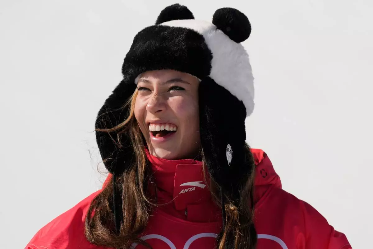 FILE - Gold medal winner China's Eileen Gu celebrates during the venue award ceremony for the women's halfpipe finals at the 2022 Winter Olympics, Feb. 18, 2022, in Zhangjiakou, China. (AP Photo/Francisco Seco, File)