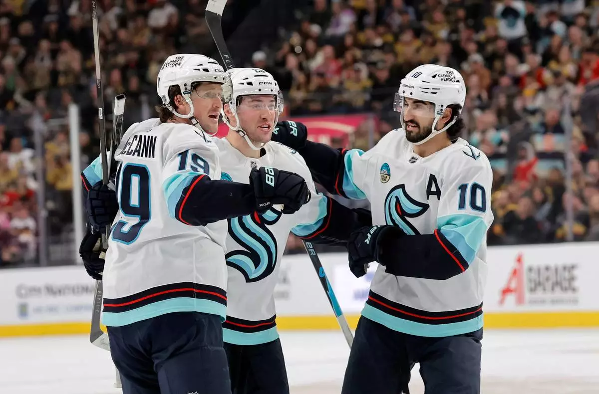 Seattle Kraken left wing Jared McCann (19) celebrates with defenseman Vince Dunn, center, and center Matty Beniers (10) after scoring against the Vegas Golden Knights during the first period of an NHL hockey game Saturday Jan. 31, 2026, in Las Vegas. (AP Photo/Steve Marcus)