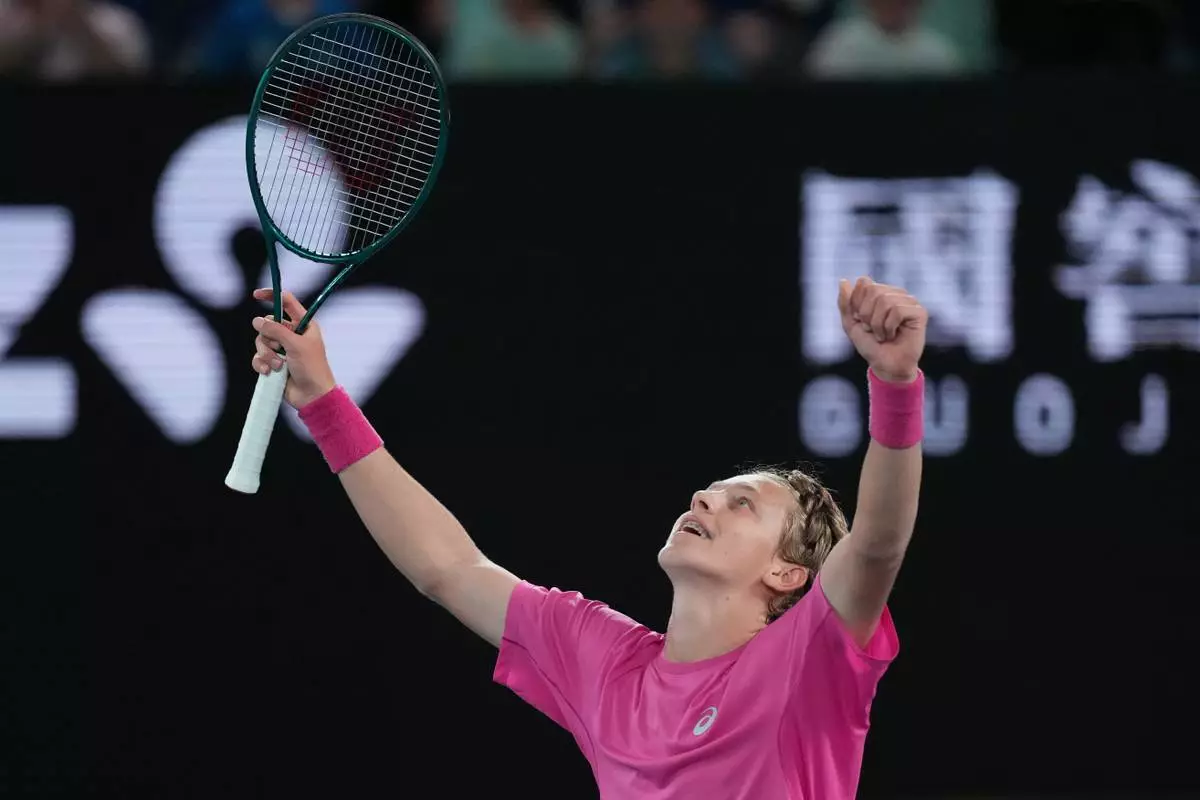 Ziga Sesko of Slovenia celebrates after defeating Keaton Hance of the U.S. in the boy's singles final at the Australian Open tennis championship in Melbourne, Australia, Sunday, Feb. 1, 2026. (AP Photo/Dar Yasin)