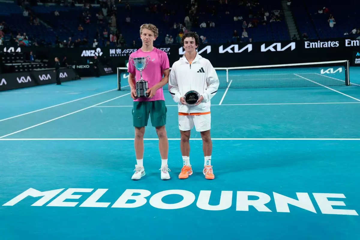 Ziga Sesko, left, of Slovenia poses with his trophy after defeating Keaton Hance, right, of the U.S. in the boy's singles final at the Australian Open tennis championship in Melbourne, Australia, Sunday, Feb. 1, 2026. (AP Photo/Dar Yasin)
