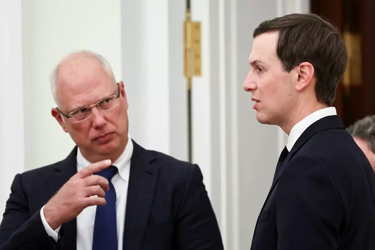 Putin's envoy Kirill Dmitriev, left, gestures speaking to U.S. President Donald Trump's envoy Jared Kushner prior to their meeting with Russian President Vladimir Putin at the Senate Palace of the Kremlin, in Moscow, Thursday, Jan. 22, 2026. (Alexander Kazakov/Sputnik, Kremlin Pool Photo via AP)