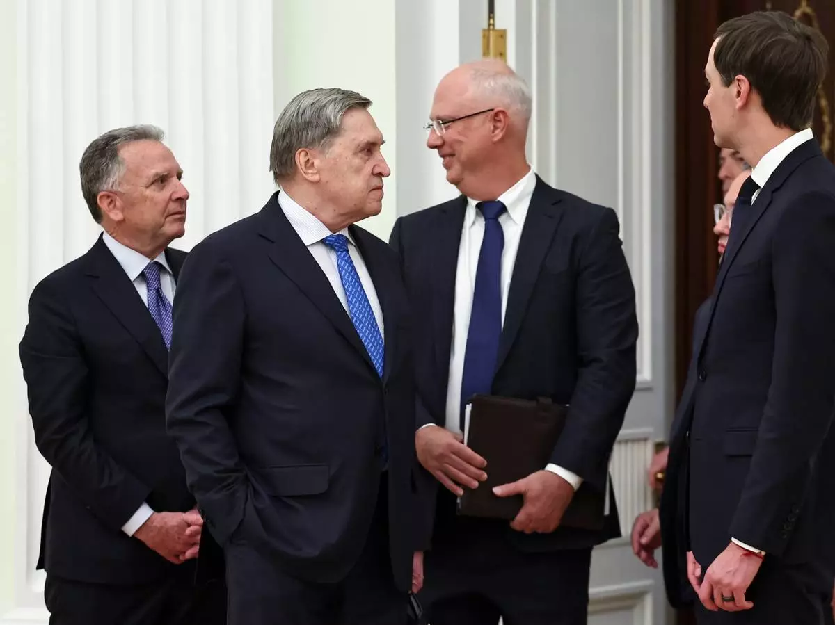 U.S. President Donald Trump's envoy Steve Witkoff, left, Kremlin foreign policy adviser Yuri Ushakov, second left, Putin's envoy Kirill Dmitriev, second right, and Trump's envoy Jared Kushner talk to each other prior to their meeting with Russian President Vladimir Putin at the Senate Palace of the Kremlin, in Moscow, Thursday, Jan. 22, 2026. (Alexander Kazakov/Sputnik, Kremlin Pool Photo via AP)
