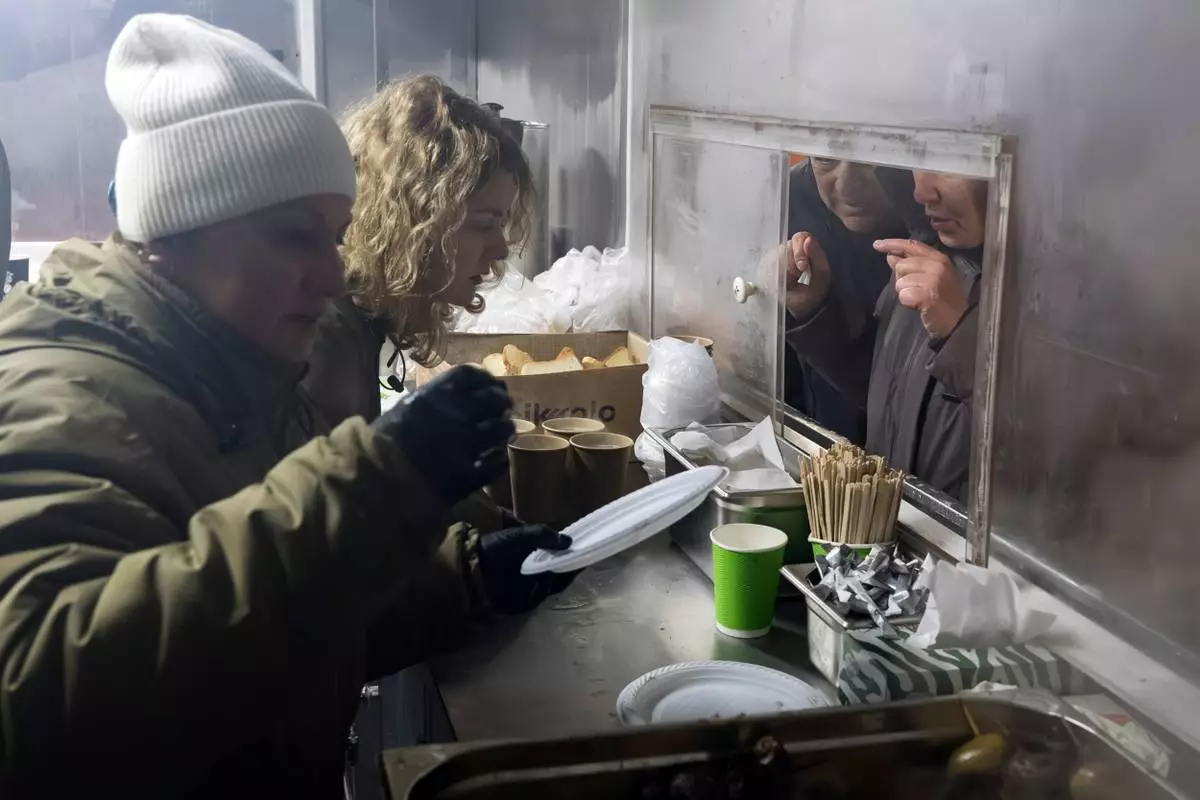 Veterans of the 3rd Separate Assault Brigade of Ukraine's Armed Forces serve free hot meals in a residential neighborhood for people without power in their homes in Kyiv, Ukraine, Saturday, Jan. 31, 2026.(AP Photo/Vladyslav Musiienko)