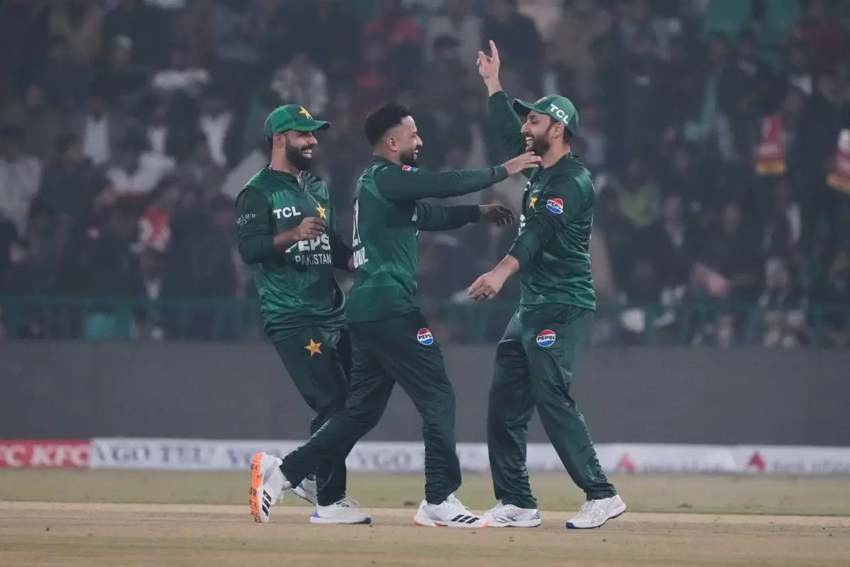 Pakistan's Mohammad Nawaz, center, celebrates with teammates after taking the wicket of Australia's Cameron Green during the third T20 cricket match between Pakistan and Australia, in Lahore, Pakistan, Sunday, Feb. 1, 2026. (AP Photo/K.M. Chaudary)