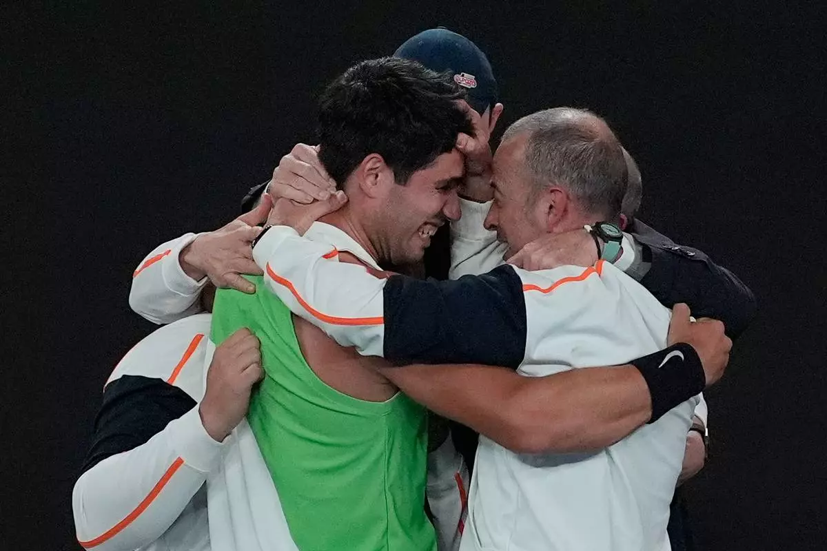 Carlos Alcaraz of Spain, left, celebrates with his team after defeating Novak Djokovic of Serbia in the men's singles final at the Australian Open tennis championship in Melbourne, Australia, Sunday, Feb. 1, 2026. (AP Photo/Asanka Brendon Ratnayake)