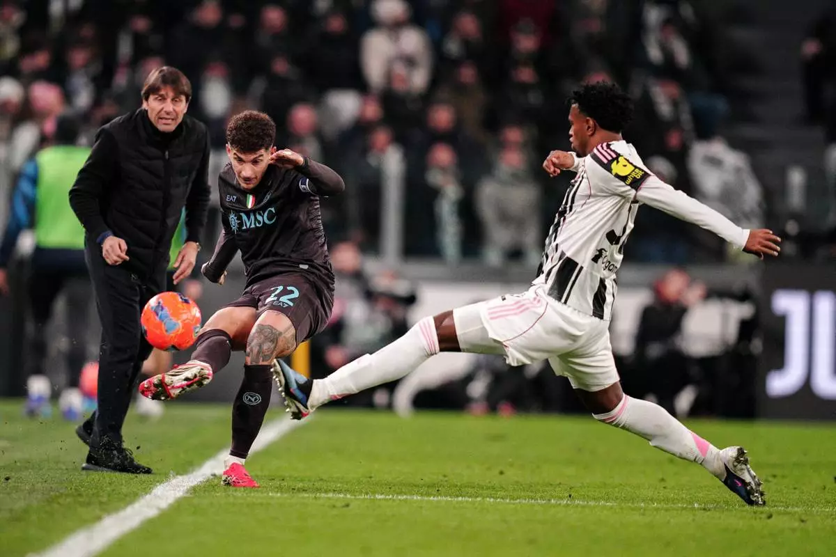 Juventus' Juan Cabal, right, fights for the ball with Napoli's Giovanni Di Lorenzo during the Italian Serie A soccer match between Juventus and Napoli in Turin, Italy, Sunday, Jan. 25, 2026. (Marco Alpozzi/LaPresse via AP)