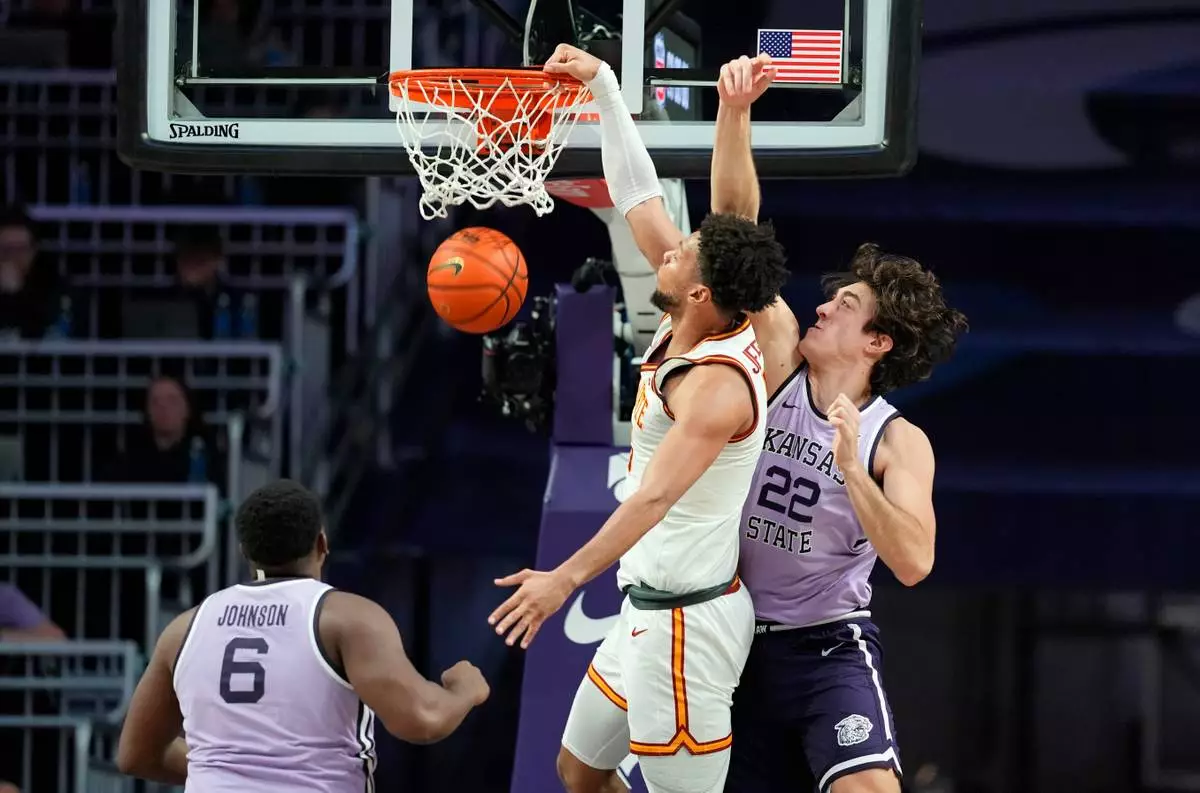 Iowa State forward Joshua Jefferson, second from right, dunks against Kansas State center Dorin Buca (22) during the second half of an NCAA college basketball game, Sunday, Feb. 1, 2026, in Manhattan, Kan. (AP Photo/Nick Krug)