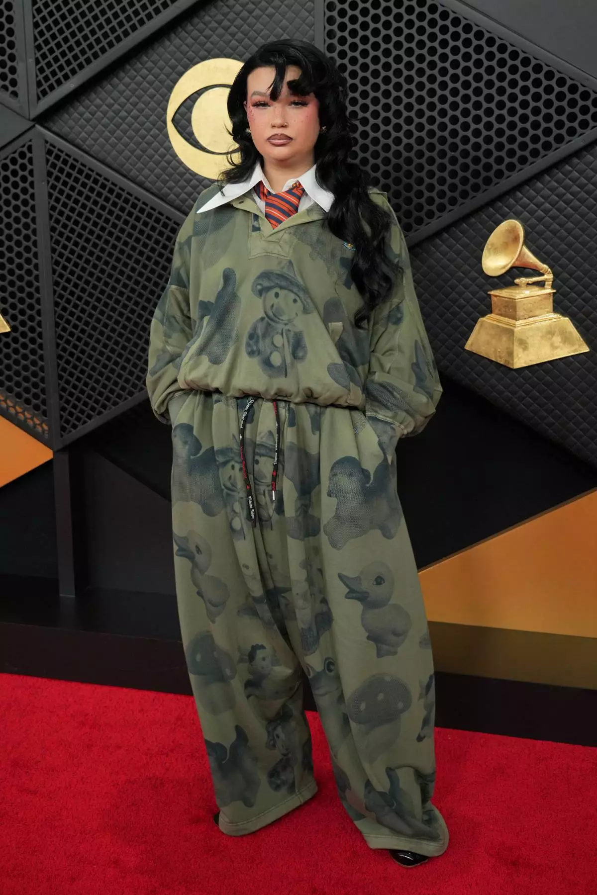 The British rising stars Lola Young and PinkPantheress who are shaking up the music industry with their individual sounds both opted for vastly different Vivienne Westwood looks Sunday. Best new artist nominee Young, who is back after taking a brief hiatus last year, sported an army green sweatsuit printed with children’s toys on the carpet. PinkPantheress opted for a signature corseted off-the-shoulder gown draped with the Union Jack symbol.