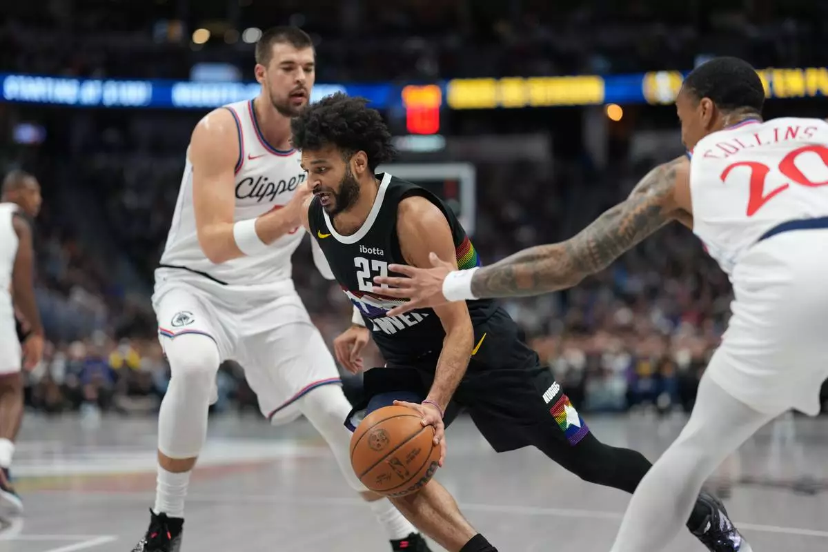 Denver Nuggets guard Jamal Murray, center, drives to the basket between Los Angeles Clippers centers Ivica Zubac, left, and John Collins (20) in the first half of an NBA basketball game Friday, Jan. 30, 2026, in Denver. (AP Photo/David Zalubowski)