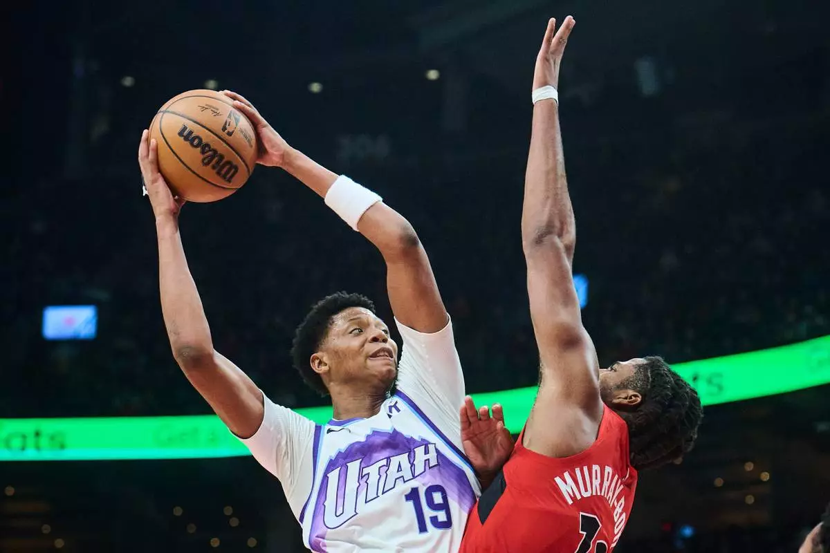 Utah Jazz's Ace Bailey (19) is blocked on a drive to the net by Toronto Raptors' Collin Murray-Boyles during the first half of an NBA basketball game in Toronto, Sunday, Feb. 1, 2026. (Sammy Kogan/The Canadian Press via AP)