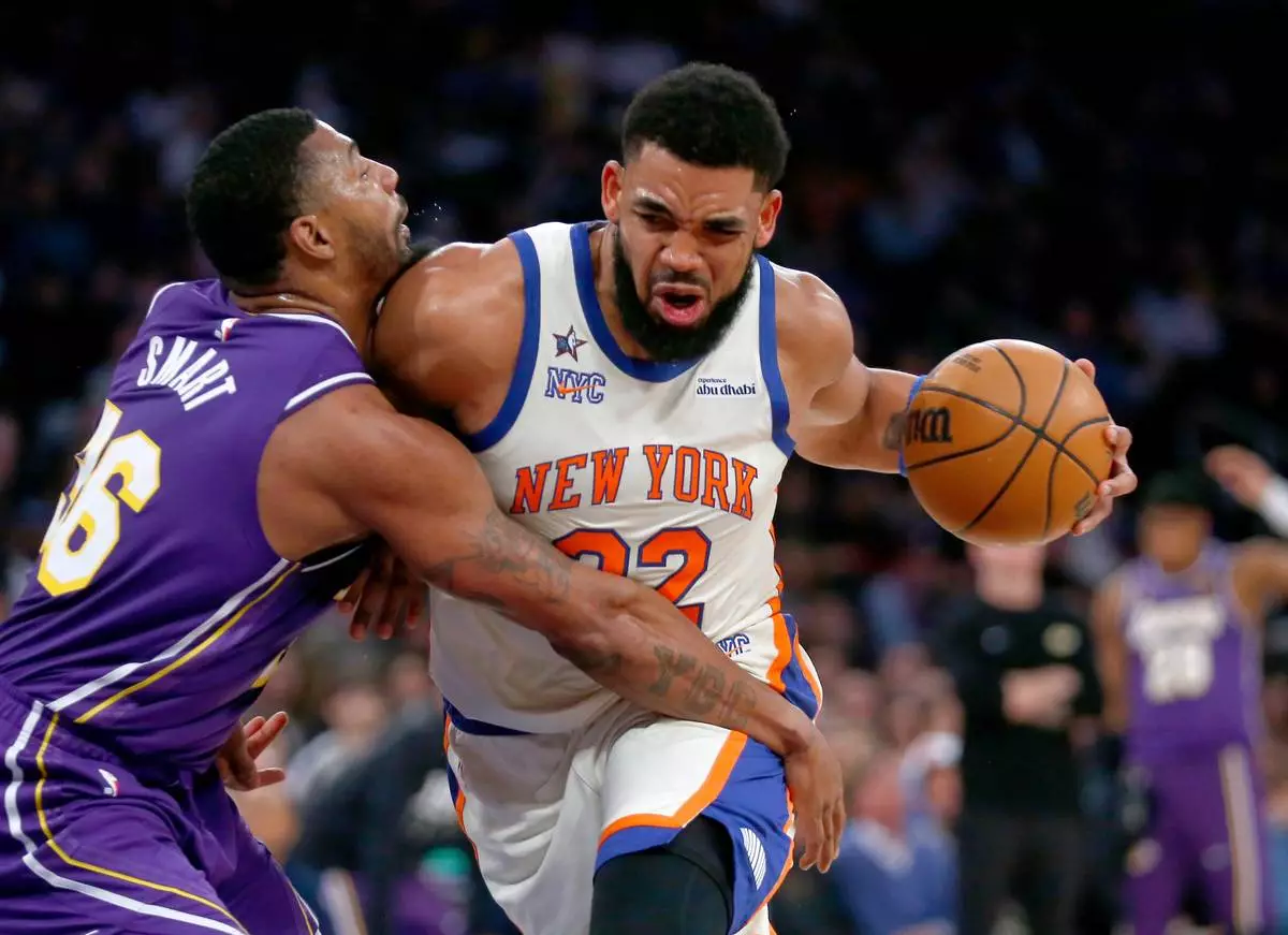 Los Angeles Lakers guard Marcus Smart, left, defends against New York Knicks center Karl-Anthony Towns, right, during the first half of an NBA basketball game, Sunday, Feb. 1, 2026, in New York. (AP Photo/John Munson)