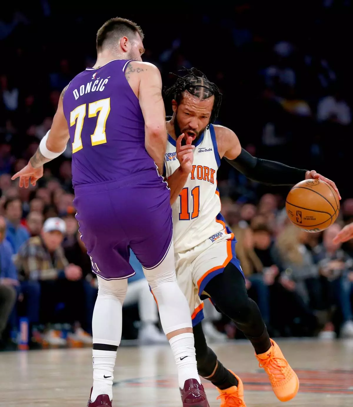 Los Angeles Lakers guard Luka Doncic, left, defends against New York Knicks guard Jalen Brunson, right, during the first half of an NBA basketball game, Sunday, Feb. 1, 2026, in New York. (AP Photo/John Munson)