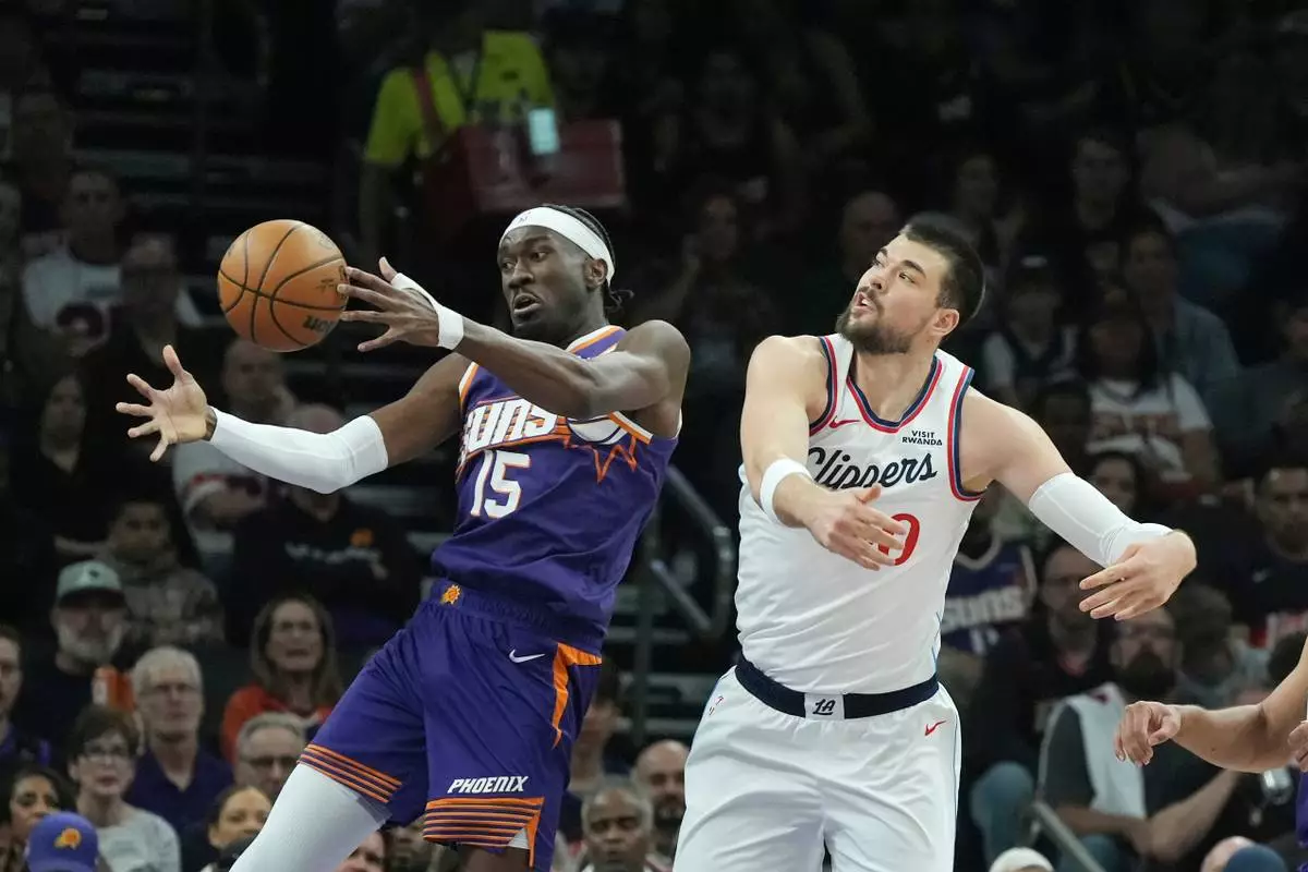 Phoenix Suns center Mark Williams (15) and Los Angeles Clippers center Ivica Zubac battle for a rebound during the first half of an NBA basketball game Sunday, Feb. 1, 2026, in Phoenix. (AP Photo/Ross D. Franklin)