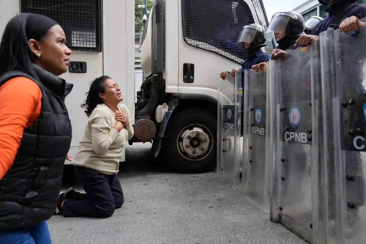 Relatives of people they consider to be detained for political reasons kneel in front of police guarding the Zona 7 Bolivarian National Police detention center in Caracas, Venezuela, Tuesday, Jan. 20, 2026. (AP Photo/Ariana Cubillos)