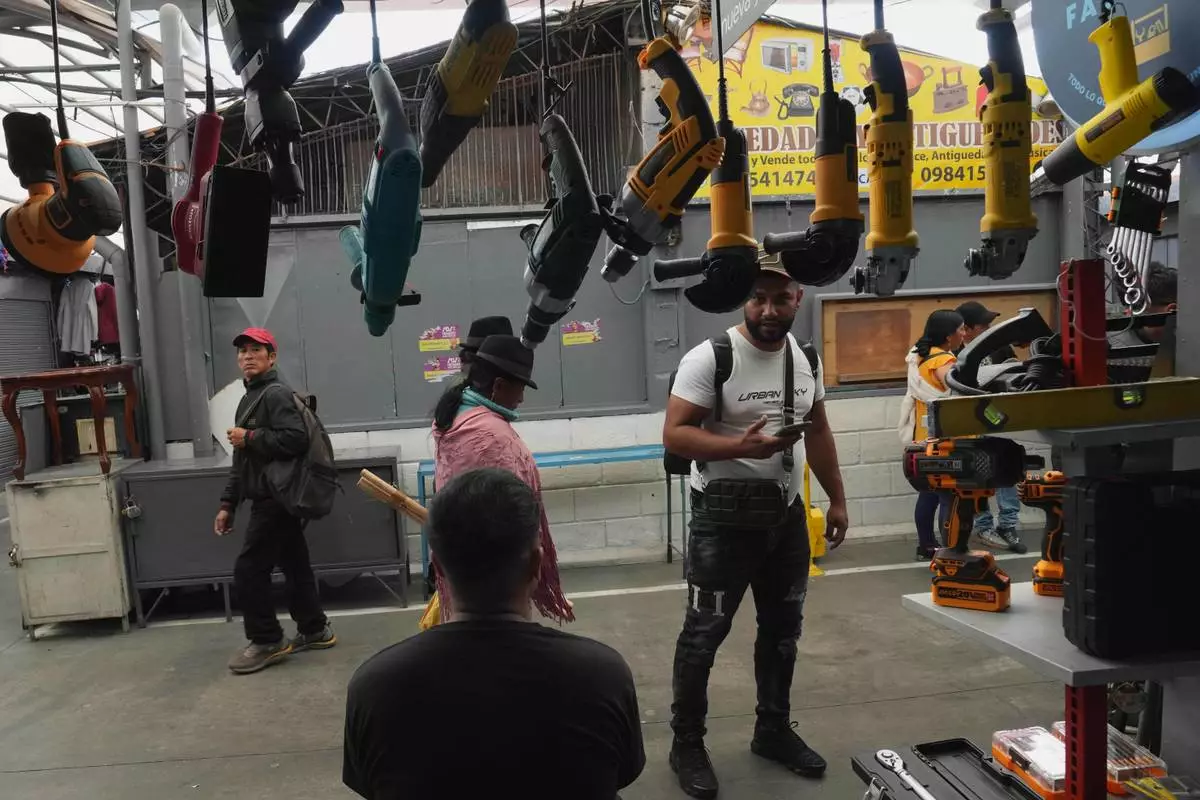 A man stops in front of a store that mostly sells tools imported from China at the Arenas Market in Quito, Ecuador, Saturday, Jan. 31, 2026. (AP Photo/Dolores Ochoa).