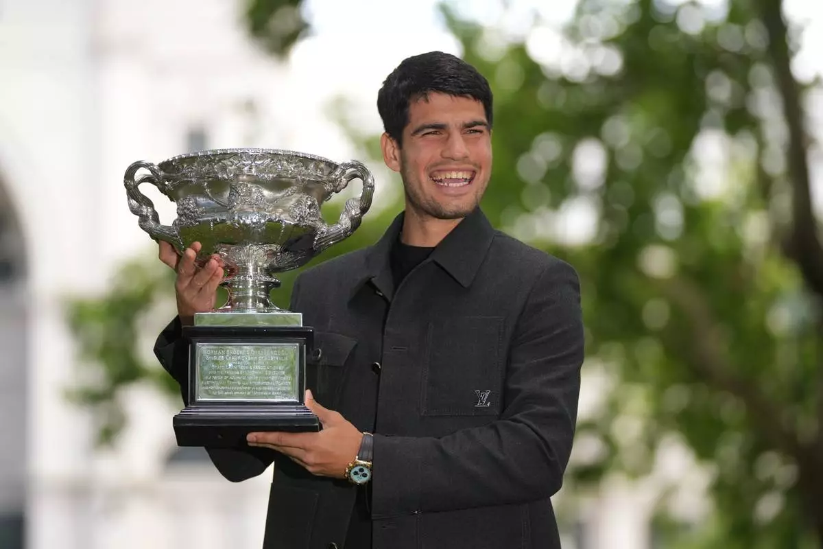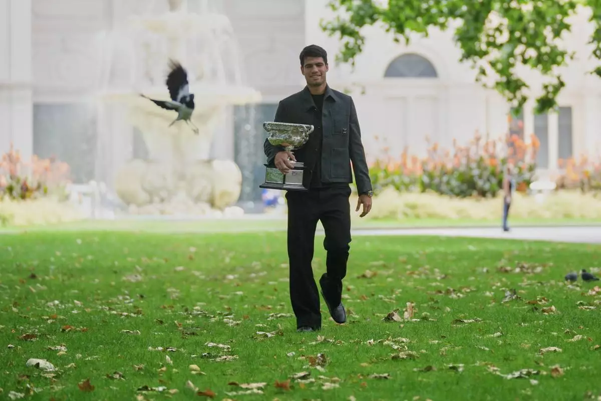 Alcaraz posed for photographers Monday with the ornate Australian Open trophy, looking casually stylish in black, in loafers and no socks. The photo shoot took place at the Royal Exhibition Building among gardens in central Melbourne.