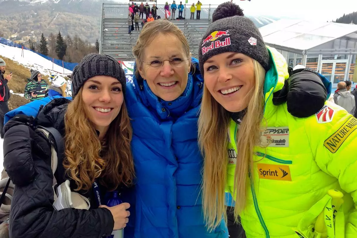 FILE - United States' Lindsey Vonn, right, poses for photographs with her mother Linda Krohn, center, and her sister Laura Kildow, at the end of an alpine ski, women's World Cup downhill race, in Cortina d'Ampezzo, Italy, Friday, Jan. 16, 2015. (AP Photo/Andrew Dampf, File)