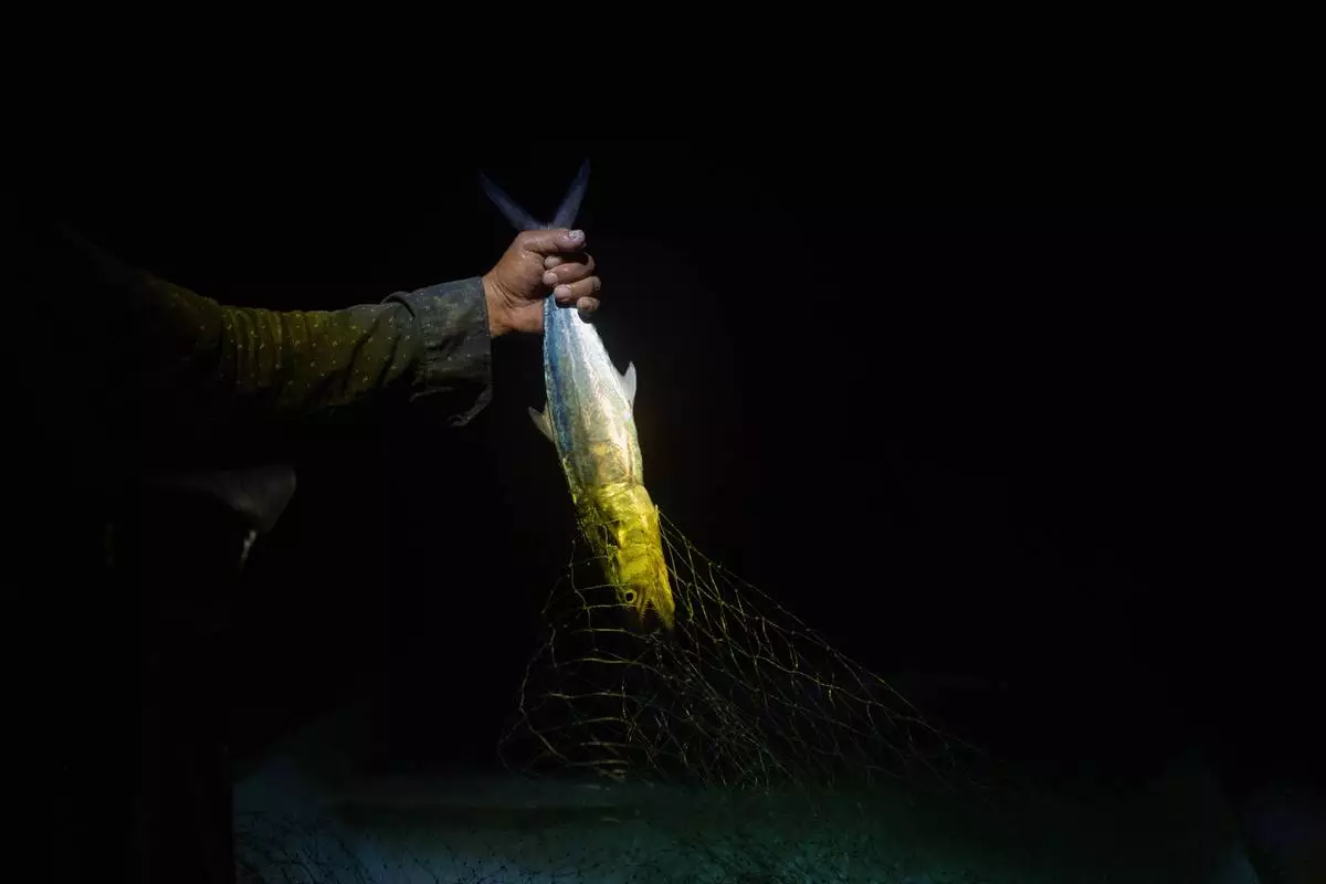 Fisherman Mauricio Contreras removes a fish from his net aboard his boat as night falls near Los Arrecifes, Mexico, Oct. 26, 2025. (AP Photo/Felix Marquez)