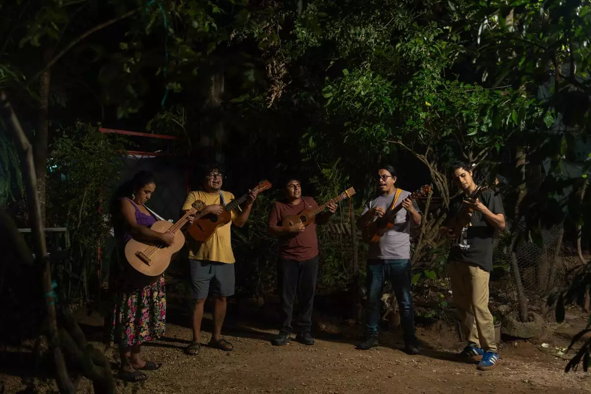 Members of the Altepee collective of musicians and activists perform in an effort to bring awareness through their music about defending their territory against infrastructure projects in Acayucan, Veracruz, Mexico, Oct. 27, 2025. (AP Photo/Felix Marquez)
