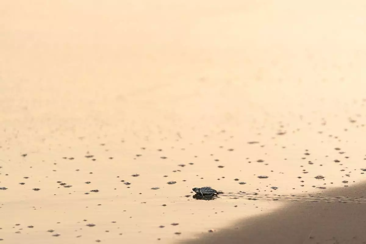 A green sea turtle hatchling approaches the sea at dawn after being released by local residents in Los Arrecifes, Mexico, Oct. 27, 2025. (AP Photo/Felix Marquez)
