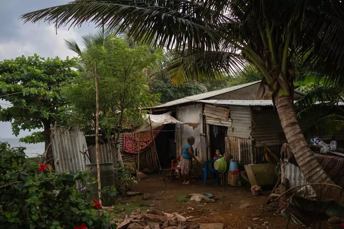 Family members appear at their home near the sea in the community of Zapotitlan, Mexico, Oct. 26, 2025. (AP Photo/Felix Marquez)