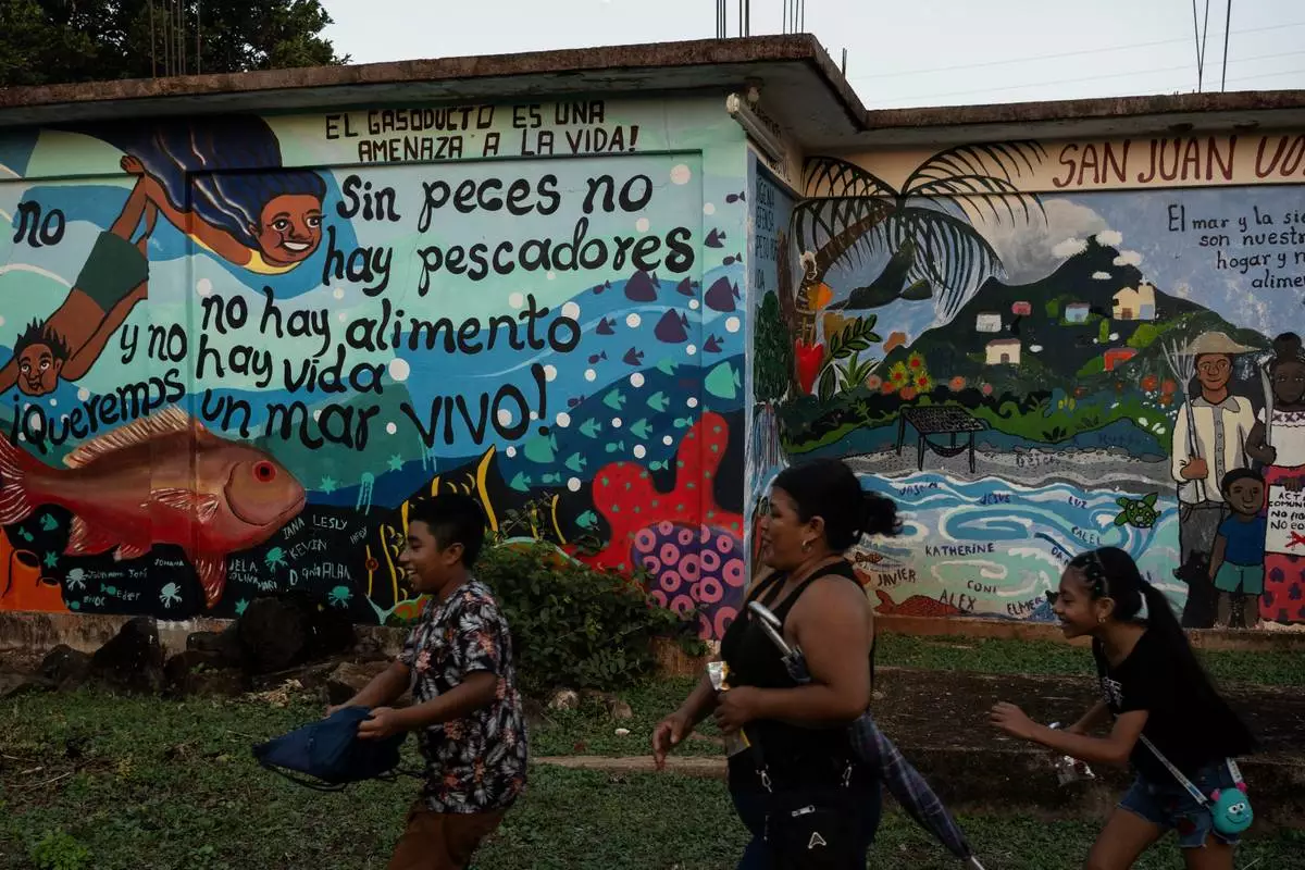A family walks past a mural defending the territory with messages like "The gas pipeline is a threat to life!" and "We want a living sea!" in San Juan Volador, Mexico, Oct. 27, 2025. (AP Photo/Felix Marquez)