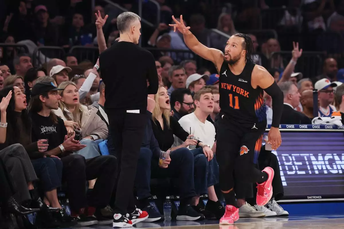 New York Knicks guard Jalen Brunson (11) gestures after scoring a three point basket during the first half of an NBA basketball game against the Chicago Bulls, Friday, April 3, 2026, in New York. (AP Photo/Heather Khalifa)