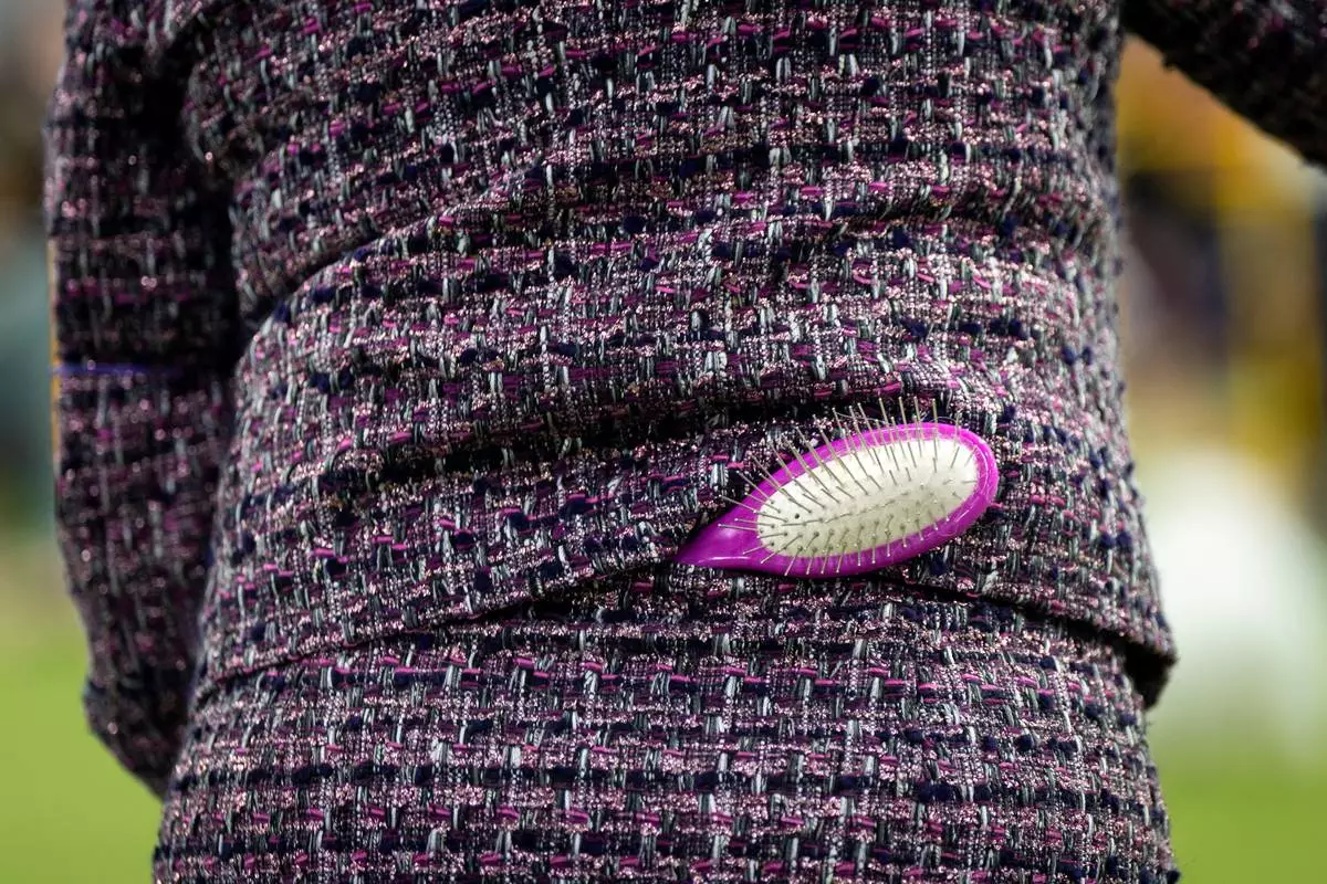 A handler keeps a dog brush in her skirt waistline while showing her dog at the 150th Westminster Kennel Club Dog Show, Monday, Feb. 2, 2026, in New York. (AP Photo/Angelina Katsanis)