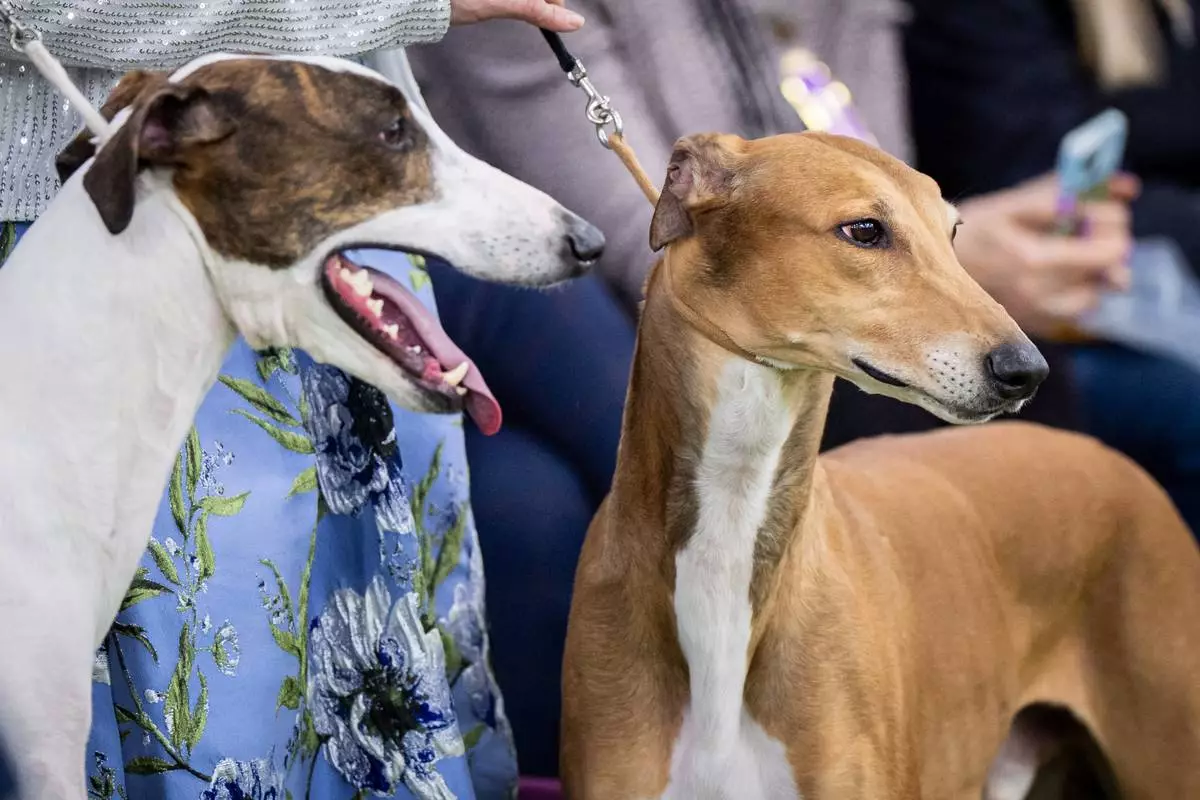 A man shows his borzoi at the 150th Westminster Kennel Club Dog Show, Monday, Feb. 2, 2026, in New York. (AP Photo/Angelina Katsanis)