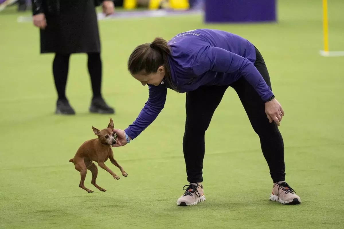 A handler and Gabby, Papillion dog, poses for a picture after competing in the Masters Agility Championship Finals at the 150th Westminster Kennel Club Dog show, Saturday, Jan. 31, 2026, at the in New York. (AP Photo/Yuki Iwamura)