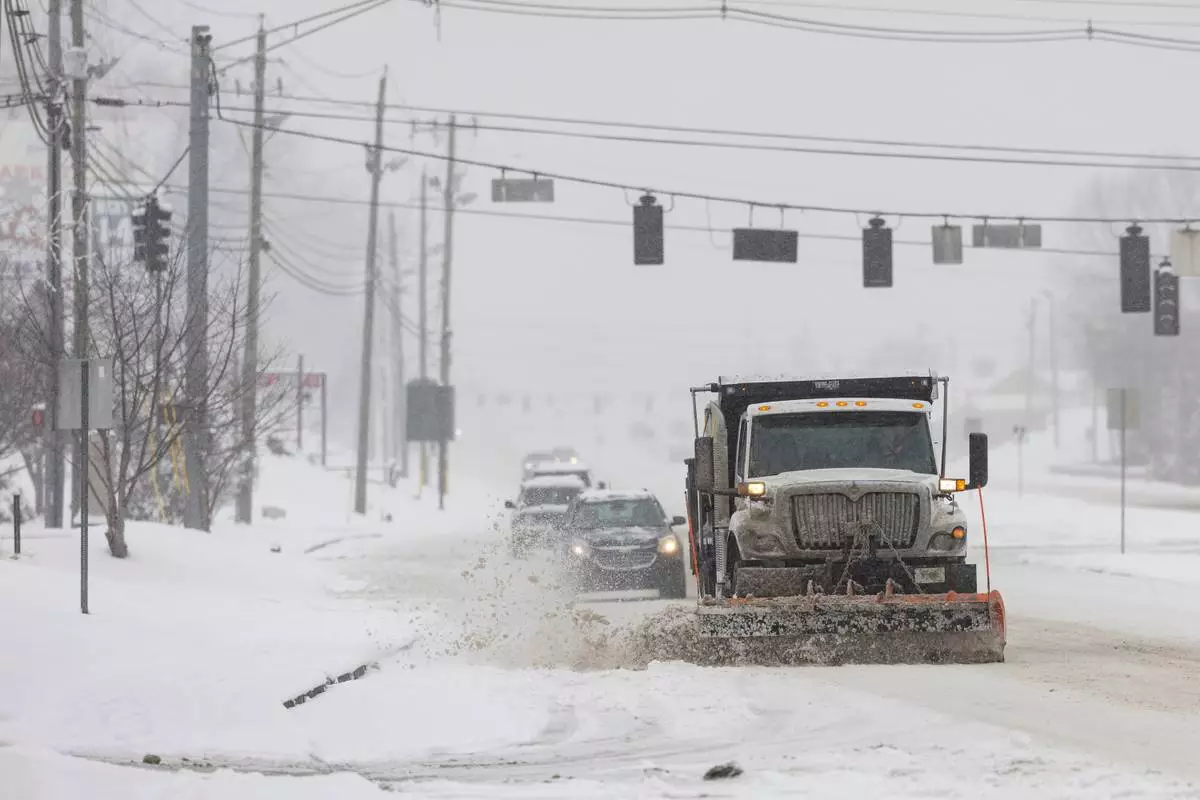 A truck plows snow along the parkway during a winter storm Saturday, Jan. 31, 2026, in Sevierville, Tenn. (AP Photo/Wade Payne)