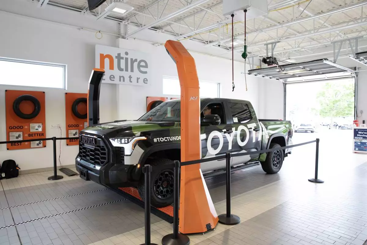 ACV’s VIPER inspection towers installed in a dealership service drive, designed with a compact footprint that fits easily into existing lanes while enabling AI-powered vehicle condition capture.