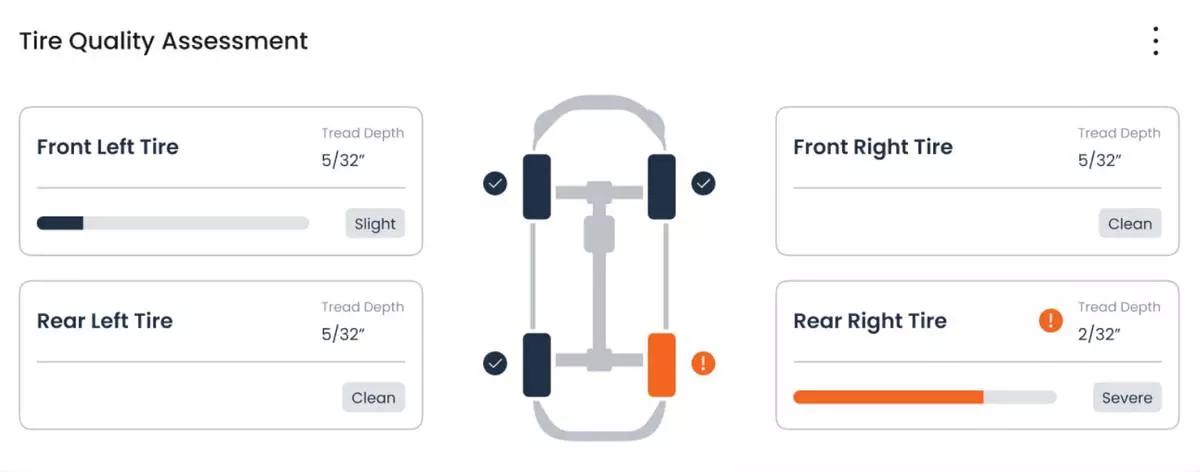 A tire quality assessment generated by ACV’s VIPER, using AI-powered imaging to evaluate tread condition as part of a standardized vehicle inspection.