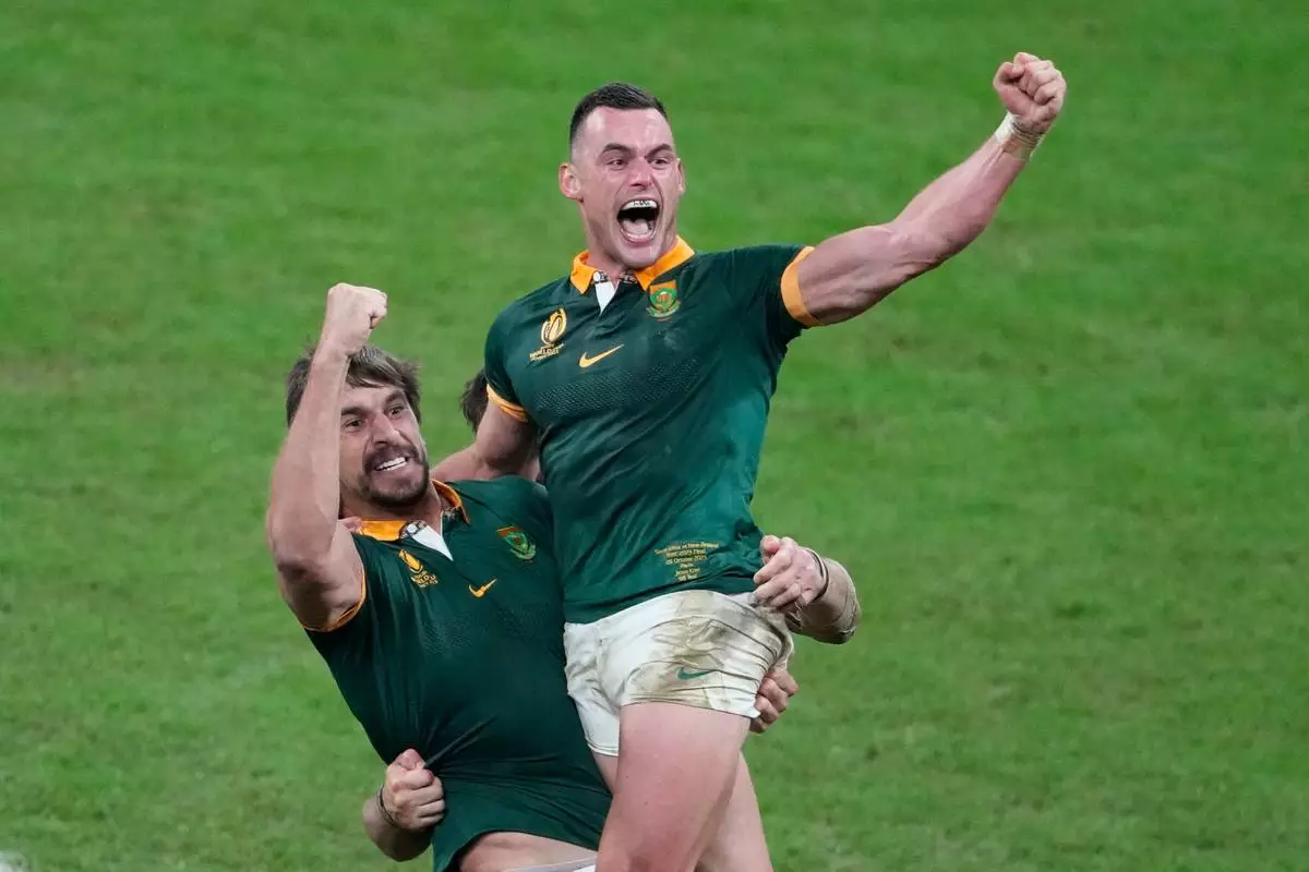 FILE - South Africa's Jesse Kriel celebrates with team mates after the Rugby World Cup final match between New Zealand and South Africa at the Stade de France in Saint-Denis, near Paris, Oct. 28, 2023. (AP Photo/Themba Hadebe, File)