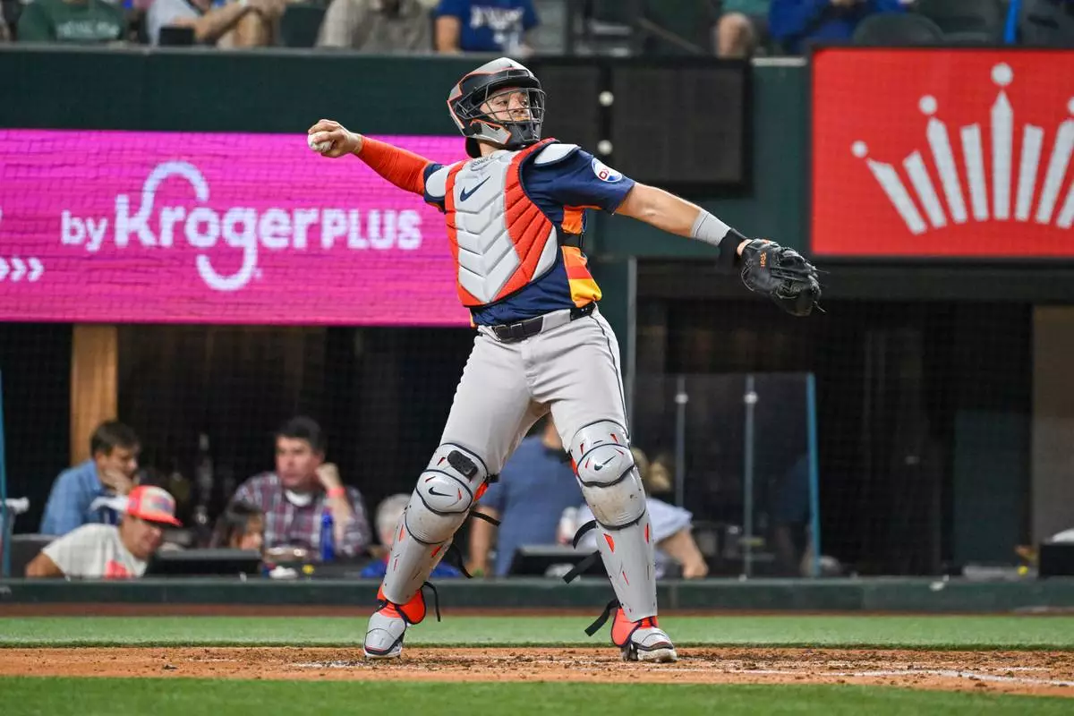 FILE - Houston Astros Yanier Diaz throws to second base in the eighth inning of a baseball game, Aug 6, 2024, in Arlington, Texas. (AP Photo/Albert Pena, File)