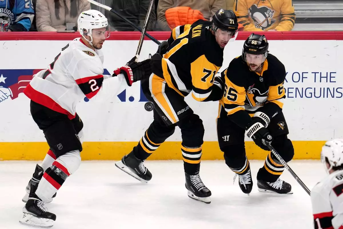 Ottawa Senators' Artem Zub (2) is defended by Pittsburgh Penguins' Evgeni Malkin (71) and Erik Karlsson (65) during the first period of an NHL hockey game in Pittsburgh, Monday, Feb. 2, 2026. (AP Photo/Gene J. Puskar)