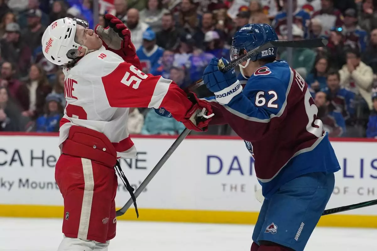Detroit Red Wings center Emmitt Finnie, left, reacts after getting hit in the face by Colorado Avalanche left wing Artturi Lehkonen in the second period of an NHL hockey game, Monday, Feb. 2, 2026, in Denver. (AP Photo/David Zalubowski)