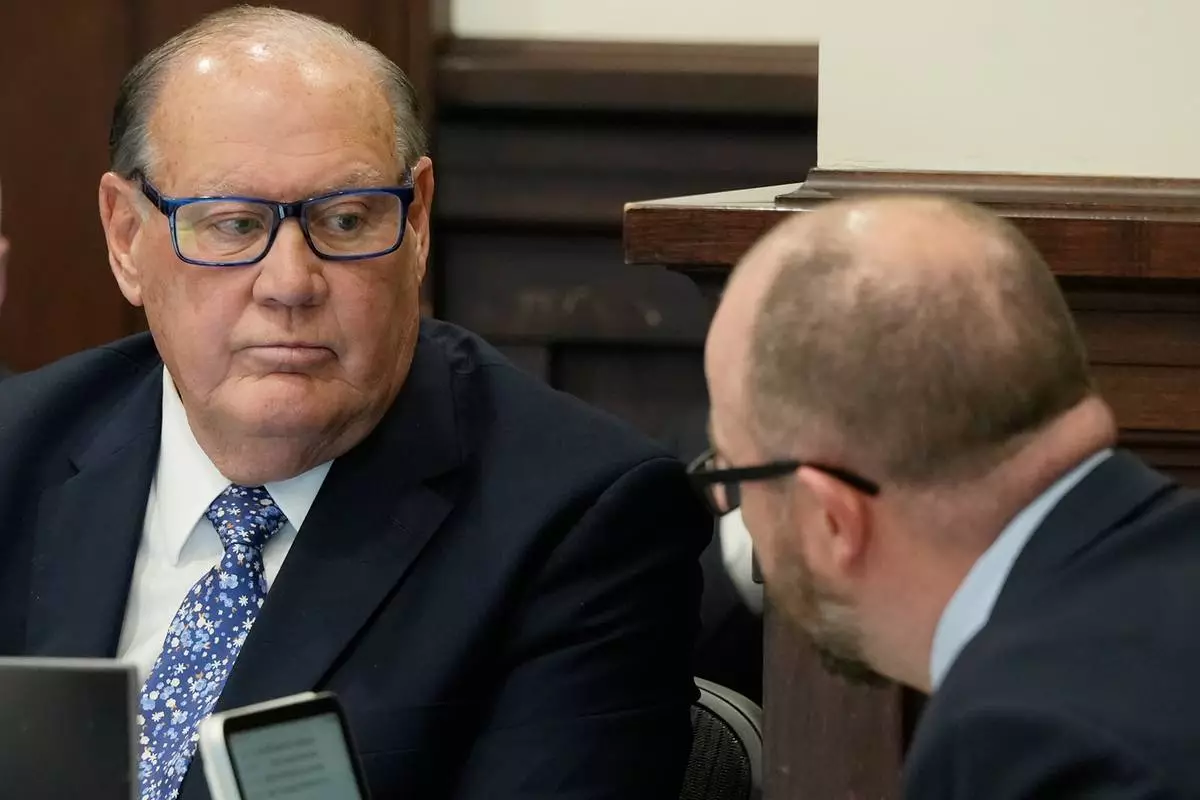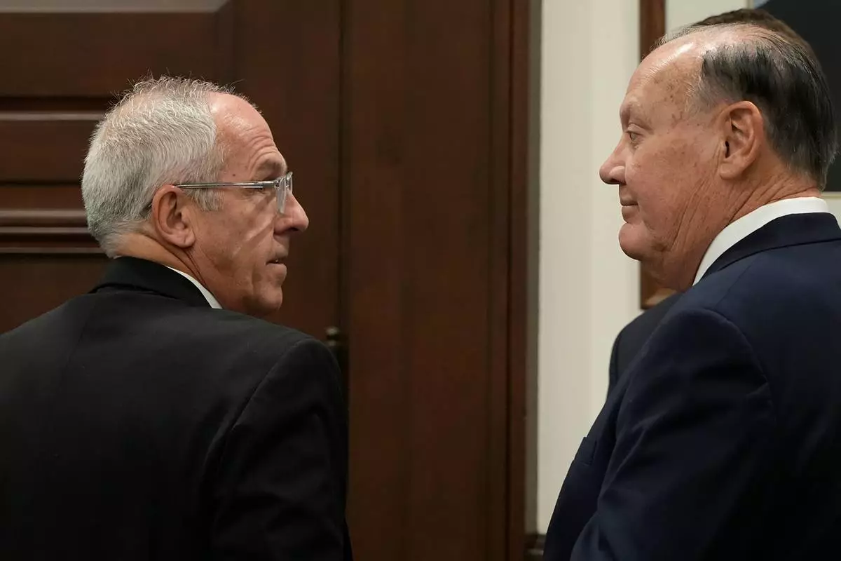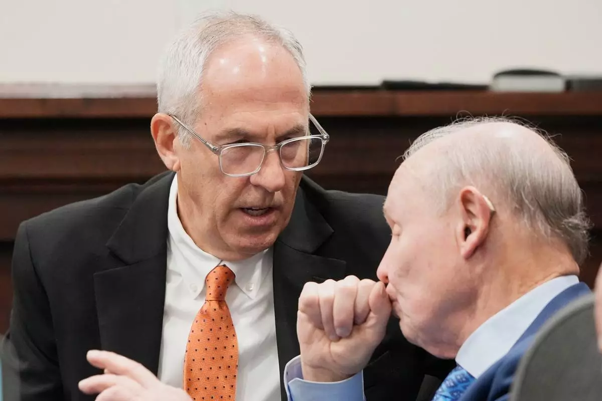 Michael Dowling, left, talks with his attorney, Dan Webb, before the start of his trial in Summit County Court of Common Pleas Judge Susan Baker Ross's courtroom on Tuesday, Feb. 3, 2026, in Akron, Ohio. (Mike Cardew/Akron Beacon Journal via AP, Pool)
