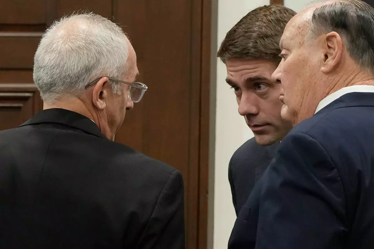 Defendants Michael Dowling, left, and Chuck Jones, right, talk with Attorney Matthew Durkin, center, as they wait for the start of their trial in Summit County Court of Common Pleas Judge Susan Baker Ross's courtroom on Tuesday, Feb. 3, 2026, in Akron, Ohio. (Mike Cardew/Akron Beacon Journal via AP, Pool)