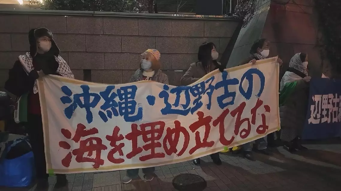 A group of Japanese people gathered in front of the Ministry of Defense in Tokyo on Monday to voice their opposition to the government's sharp increase in defense spending and its continued push for the construction of a new U.S. military base at Henoko in Okinawa.