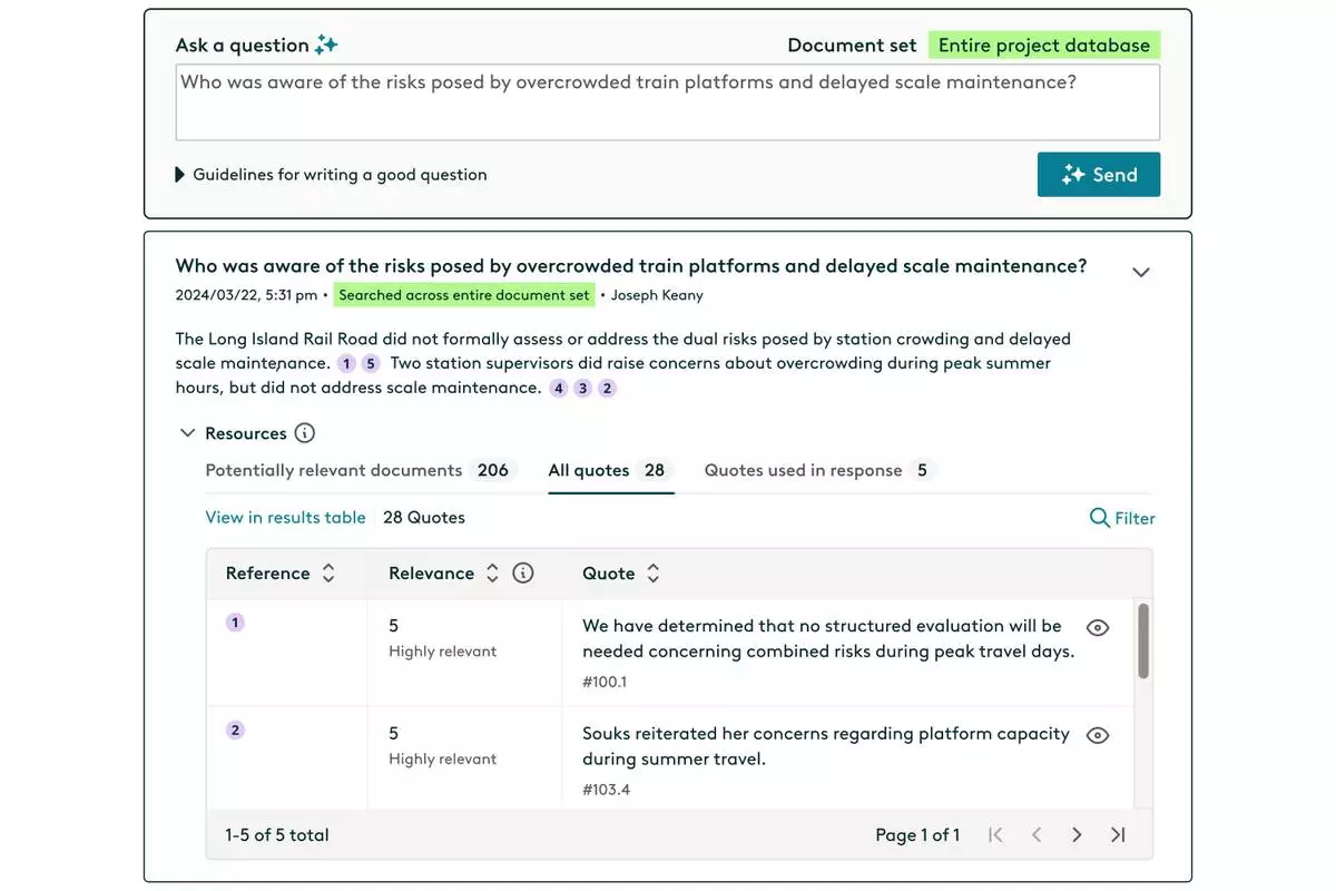 Everlaw AI Deep Dive fundamentally reshapes the way legal teams conduct document review by allowing users to ask natural language questions of an entire document corpus – terabytes in size – and receive rapid, reliable, citation-backed answers directly from their documents. Answers are ranked by confidence level and supported with a list of facts and referenceable resources. When insufficient evidence exists, the system is designed to explicitly indicate that limitation rather than generating unreliable content. Deep Dive helps legal teams move beyond simple document retrieval to intelligent fact extraction and analysis, while maintaining the verification standards essential to legal practice. Deep Dive is helpful throughout the litigation lifecycle: early case assessment, production review, deposition prep and trial readiness.