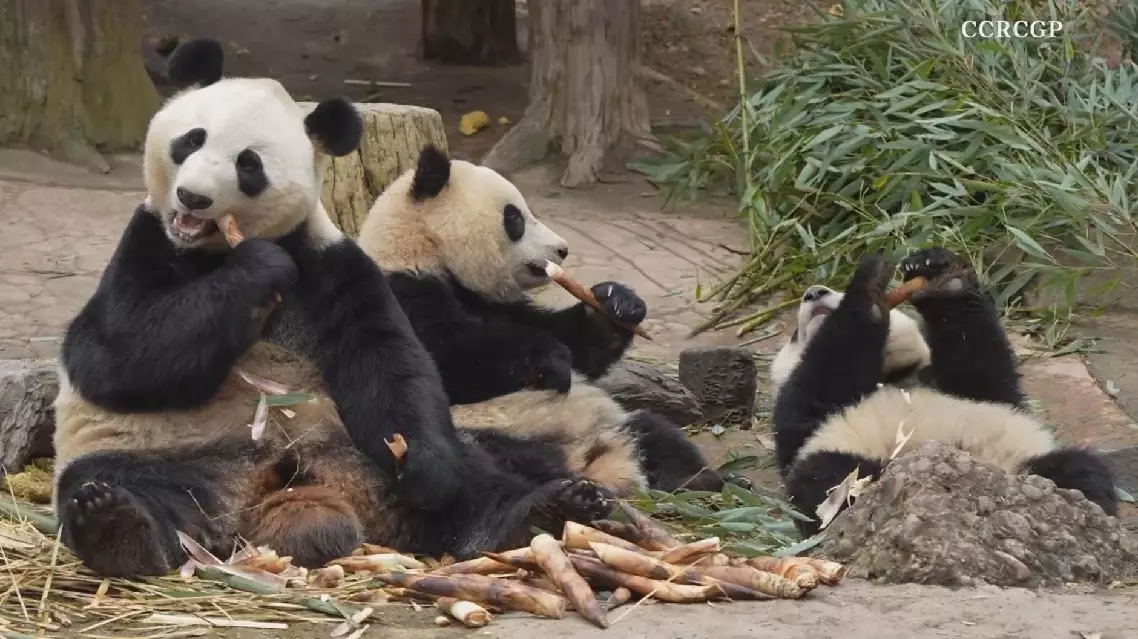 Giant panda families gather to share happy mealtime with bamboo banquet