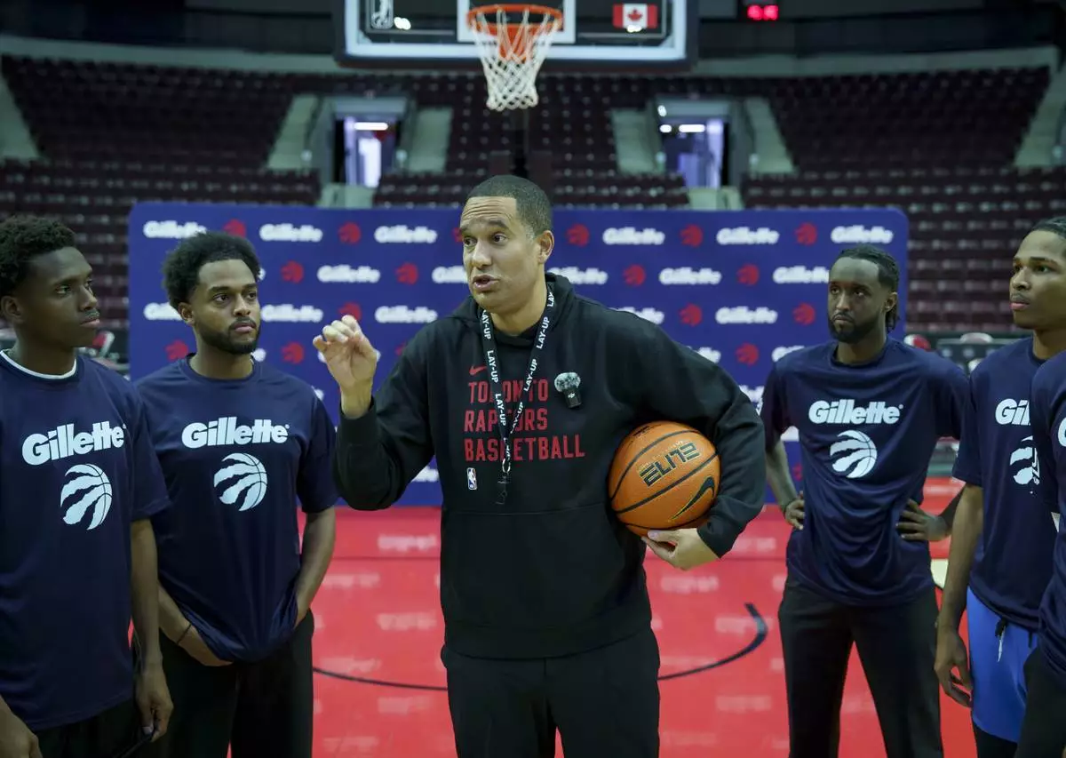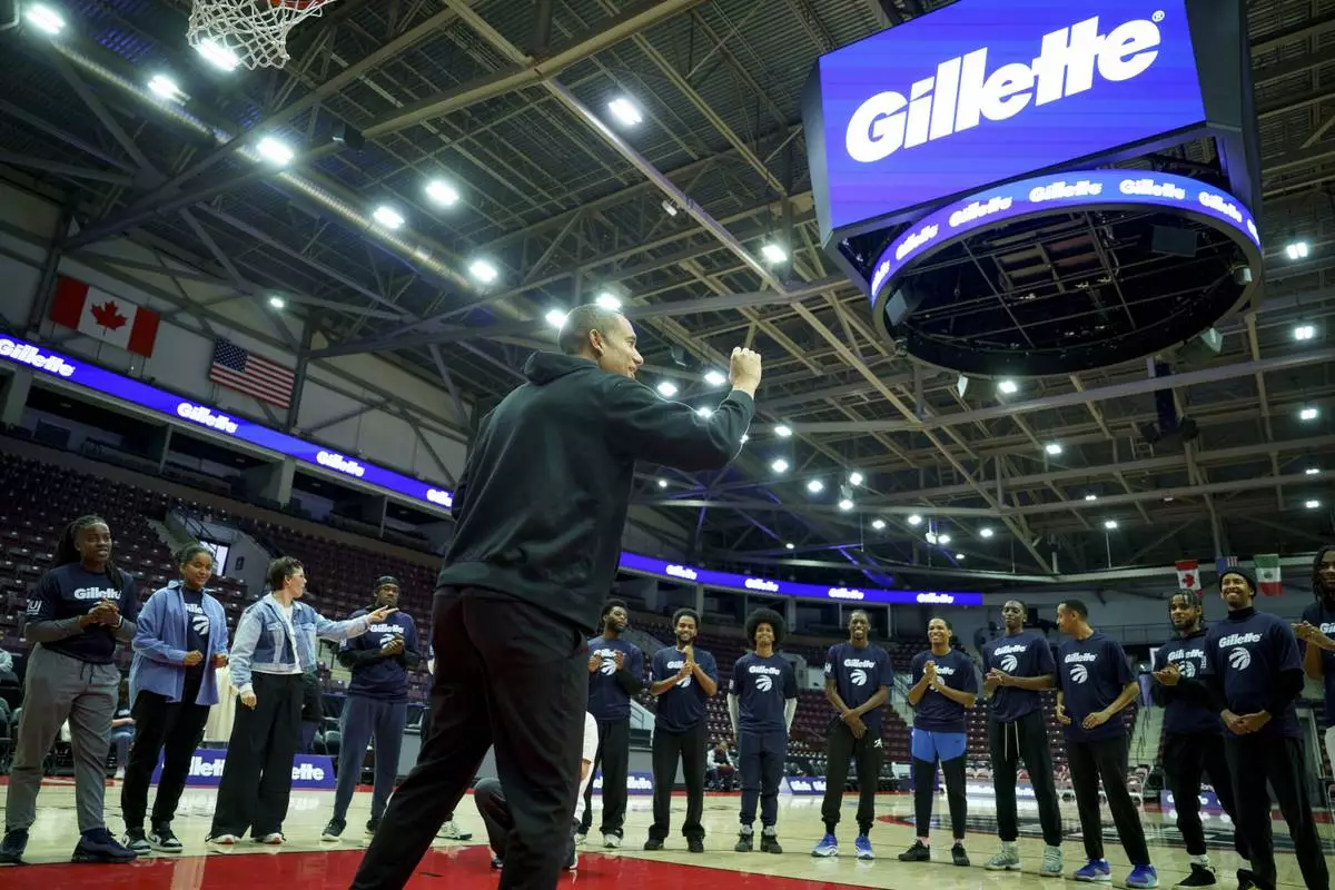 Toronto Raptors player and Gillette ambassador Gradey Dick speaks with Lay-Up youth coaches during an on-court learning session hosted by Gillette in Toronto.