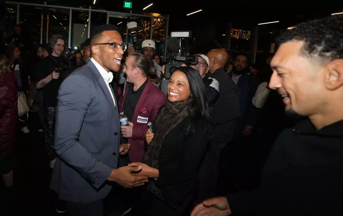 Texas Congressional Candidate Christian Menefee greets supporters during his watch party at The Post Houston on Election Day, in Houston, Saturday, Jan. 31, 2026. (AP Photo/ Karen Warren)
