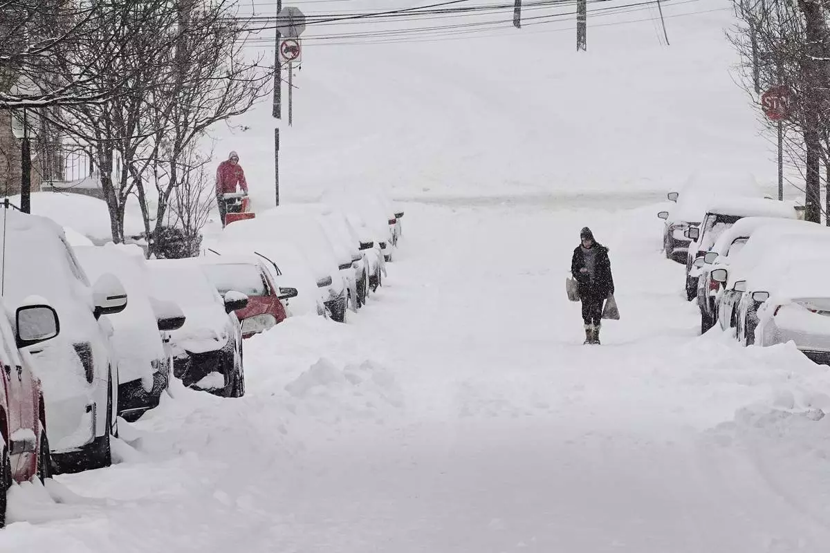 FILE - A person carries grocery bags up a residential street during a winter storm Jan. 25, 2026, in Cincinnati. (AP Photo/Joshua A. Bickel, File)