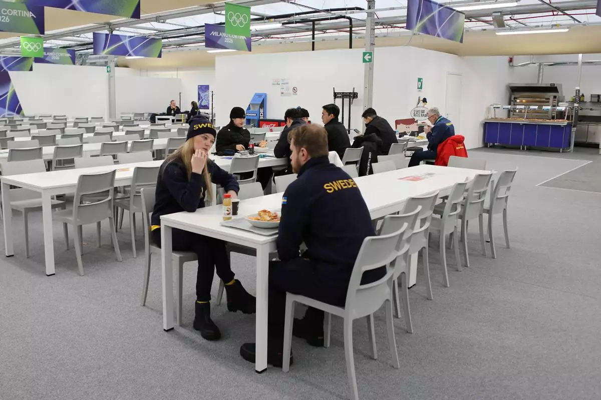 Members of Team Sweden eat at the main dining hall at the Cortina Olympic Village, ahead of the 2026 Winter Olympics, in Cortina d'Ampezzo, Italy, Tuesday, Feb. 3, 2026. (AP Photo/Jennifer McDermott)