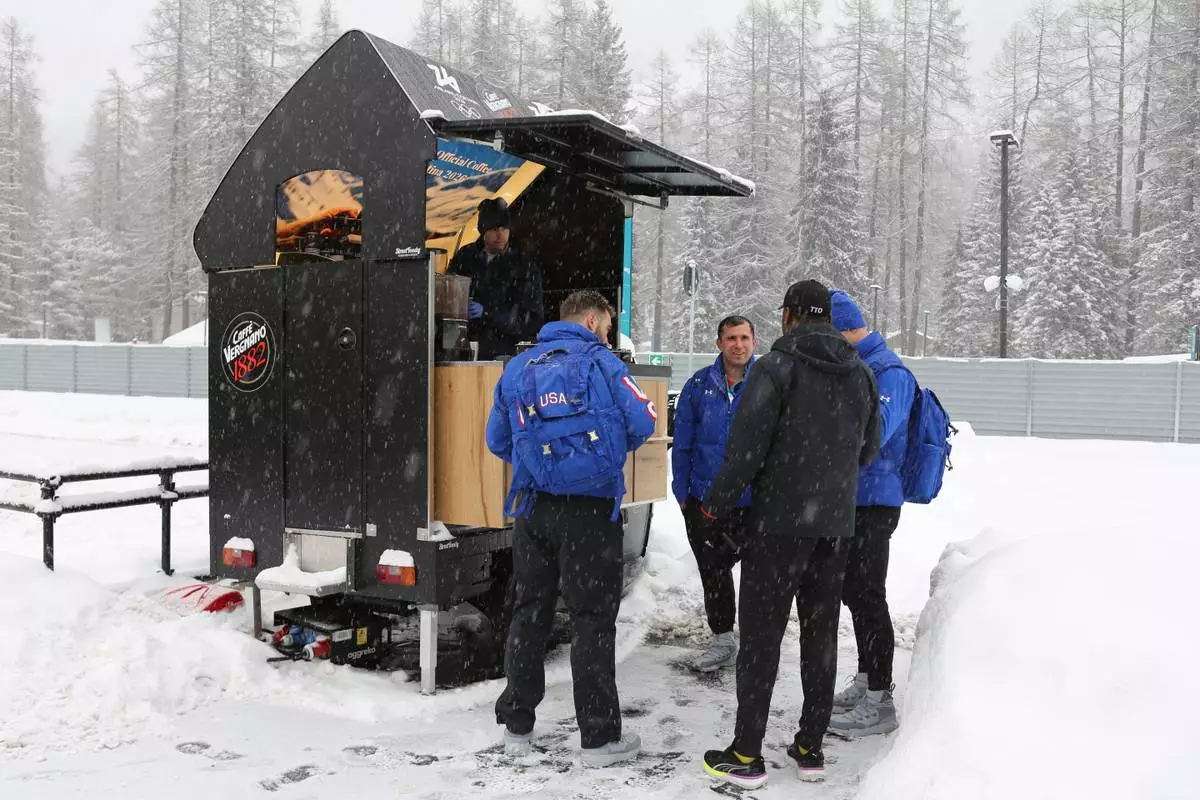 CORTINA D'AMPEZZO, Italy (AP) — Athletes at the Cortina Olympic and Paralympic Village on Tuesday chatted at an outdoor coffee stand, traded their unique national team pins and took in the atmosphere of the Dolomites as snow steadily fell.