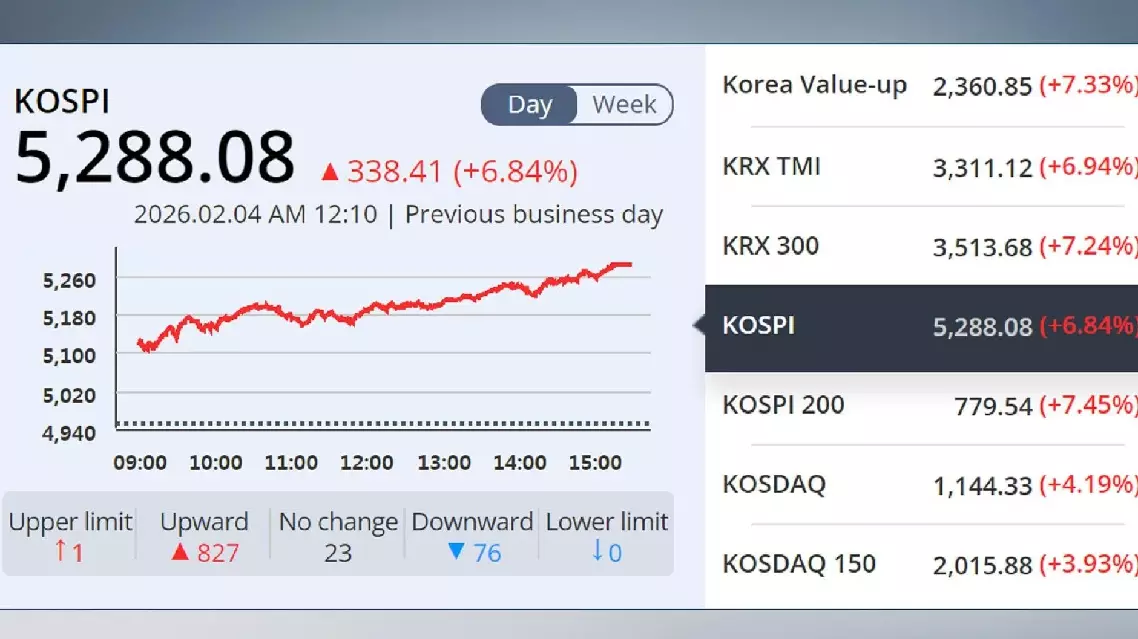The benchmark Korea Composite Stock Price Index (KOSPI) soared 338.41 points, or 6.84 percent, to hit a new closing high of 5,288.08, marking its biggest single-day gain in six years.